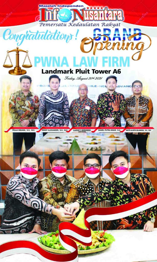 Media info Nusantara-Acara pembukaan dan peresmian kantor hukum Advokat dan Konsultan Hukum ”PWNA LAW FIRM”. Yang beralamat di Land Mark Pluit Tower 6A Jum’at 20 Agustus 2021. Turut hadir dalam acara, para Advocat dan konsultan hukum, para wartawan, perwakilan dari kepolisian, kejaksaan, dan para undangan lainnya. Dalam kesempatan itu, Advocat Rendy Alexander, S.H., M.H. bersama rekanannya, Praja Wibawa, S.H., M.H. Nikite Alvinta Bujangga, S.H., M.H. Daniel Putra Insar, S.H.dan Lucky Widodo sebagai advice. Berssyukur atas pembukaan dan peresmian kantor hukum mereka.