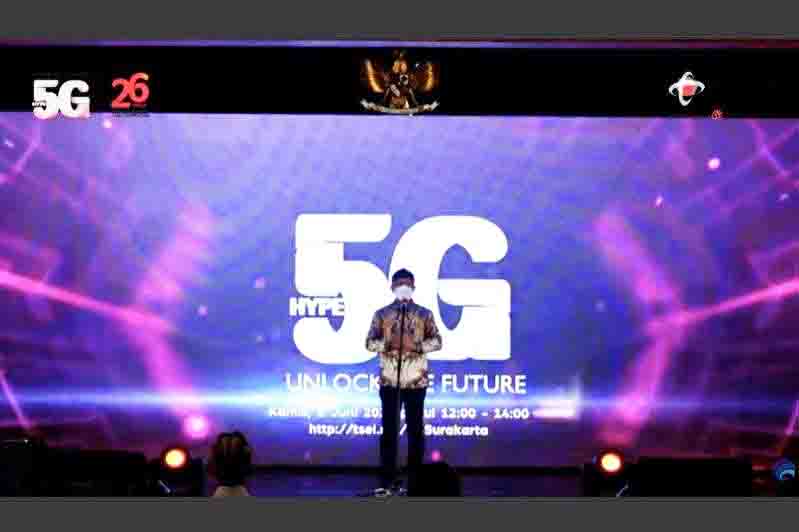 Survei Ookla menemukan bahwa kecepatan internet 5G Indonesia sukar menandingi kecepatan teknologi serupa di Vietnam. Foto: Menteri Komunikasi dan Informatika Johnny G. Plate saat peluncuran layanan 5G dari Telkomsel di Solo, Jawa Tengah, Kamis (3/6/2021). (Antara]