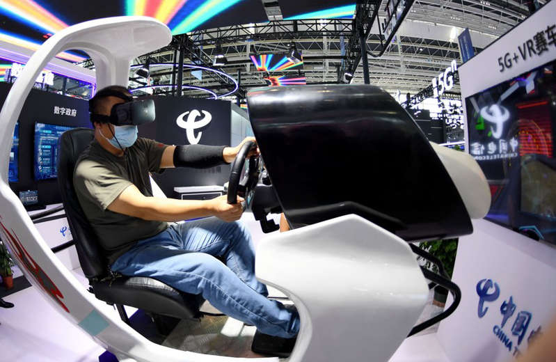 Seorang pria menjajal kokpit balap berteknologi 5G+VR di ajang Pameran Ekonomi Digital Internasional China 2021 di Shijiazhuang, Provinsi Hebei, China utara, pada 7 September 2021. (Xinhua/Wang Xiao)