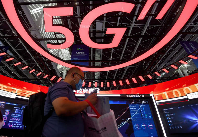 Seorang pria berjalan melewati area pameran 5G di ajang Pameran Ekonomi Digital Internasional China 2021 di Shijiazhuang, Provinsi Hebei, China utara, pada 6 September 2021. (Xinhua/Wang Xiao)