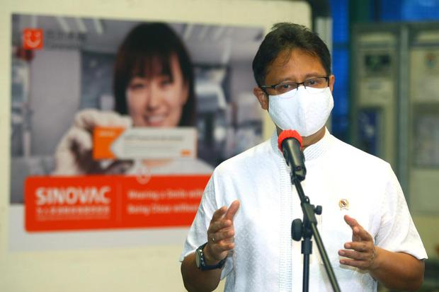 Menteri Kesehatan Budi Gunadi Sadikin memberikan keterangan pers terkait kedatangan vaksin COVID-19 Sinovac setibanya dari Beijing di Terminal Cargo Bandara Soekarno Hatta, Tangerang, Banten, Minggu (18/4/2021). Sebanyak enam juta dosis vaksin COVID-19 Sinovac yang dibawa dengan pesawat Garuda Indonesia tersebut, selanjutnya dibawa ke Bio Farma Bandung sebelum didistribusikan ke Kota dan Kabupaten di Indonesia. ANTARA/Muhammad Iqbal/aww.