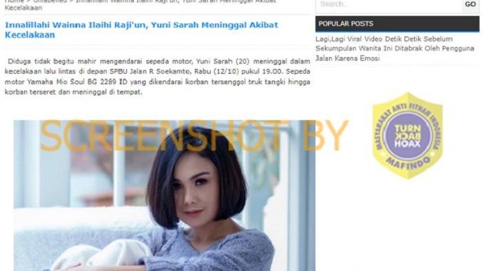 Informasi tersebut pertama kali viral dalam artikel berjudul “Innalillahi Wainna Ilaihi Raji’un, Yuni Sarah Meninggal Akibat Kecelakaan” di laman boncel[dot]xyz dengan menampilkan foto artis Yuni Shara.