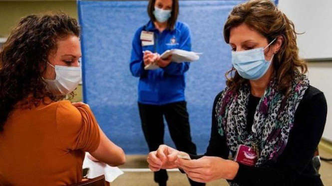 VIVA Petugas kesehatan melakukan latihan untuk administrasi vaksin COVID-19 di Universitas Kesehatan Indiana di Indianapolis, Indiana, Amerika Serikat, Jumat (11/12/2020).