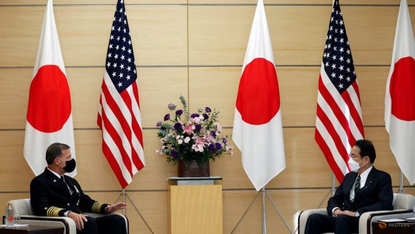 Laksamana John Aquilino, Komandan Komando Indo-Pasifik Amerika Serikat, berbicara dengan Perdana Menteri Jepang Fumio Kishida selama pertemuan mereka di kediaman resmi Kishida di Tokyo, Jepang 11 November 2021. (File foto: Reuters/Pool/Issei Kato)