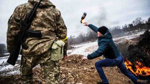 Seorang warga sipil berlatih melempar bom molotov untuk mempertahankan kota, saat invasi Rusia ke Ukraina berlanjut, di Zhytomyr, Ukraina 1 Maret 2022. (Foto: Reuters/Viacheslav Ratynskyi)