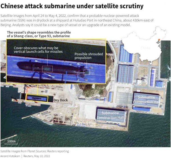 Citra satelit dari 24 April hingga 4 Mei 2022, mengonfirmasi bahwa kemungkinan kapal selam serang bertenaga nuklir (SSN) berada di dok kering di galangan kapal di Pelabuhan Huludao di timur laut China, sekitar 430 km timur Beijing.