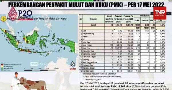 “Jumlah ternak terdampak sebanyak 3,9 juta ekor. Dan yang mengalami sakit berdasarkan konfirmasi tes PCR di laboratorium mencapai 13.968 ekor. Atau 0,36% dari populasi ternak terdampak,” kata Syahrul saat Rapat Kerja bersama Komisi IV DPR RI, Senin (23/5/2022).