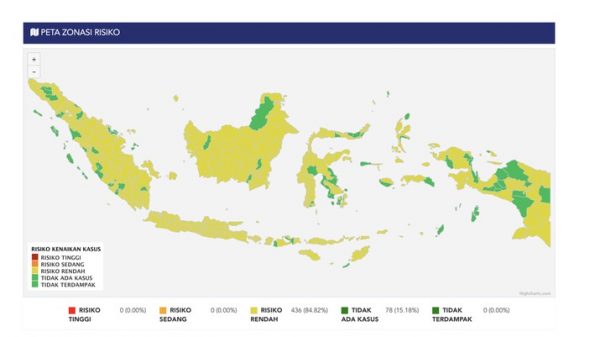 Namun, masih ada ratusan kabupaten/kota yang berstatus wilayah berisiko rendah alias zona kuning. Sebanyak 436 kabupaten/kota yang tersebar di wilayah Indonesia kini masih menyandang status daerah berisiko rendah.