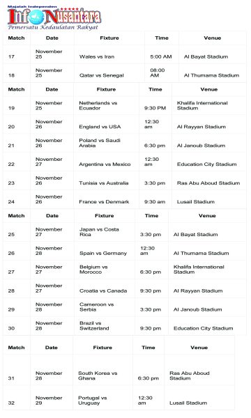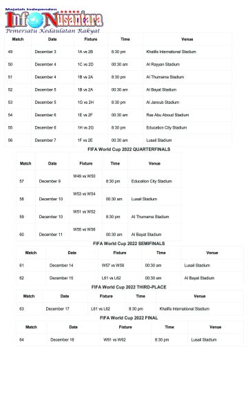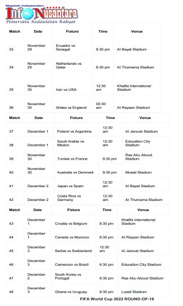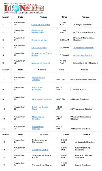 Piala Dunia FIFA 2022: Jadwal, Perlengkapan, dan Pengaturan Waktu IST Lengkap.Berikut table jadwal dibawah ini