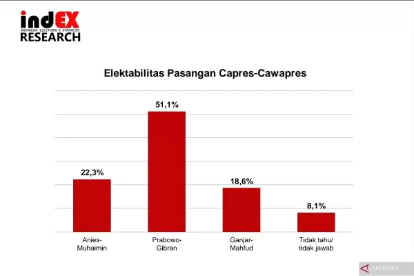 Temuan survei Indonesia Elections and Strategic (indEX) Research menunjukkan elektabiltas pasangan capres-cawapres Prabowo Subianto-Gibran Rakabuming Raka mencapai angka 51,1 persen pada periode awal Januari 2024.