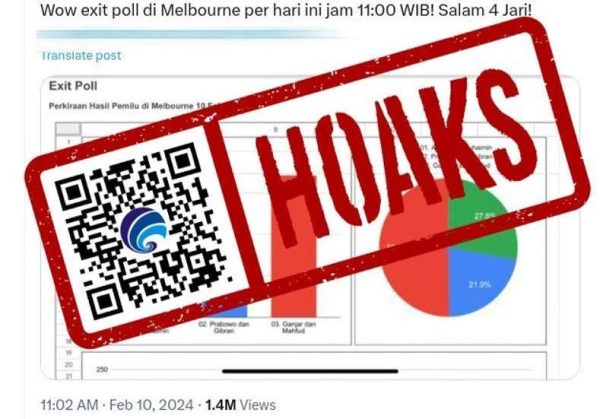 Faktanya, klarifikasi telah diberikan oleh Komisi Pemilihan Umum (KPU) RI. KPU menyebut jika hasil penghitungan sementara atau exit poll yang beredar di media sosial dari hasil Pemilu di Melbourne, Australia adalah hoaks.