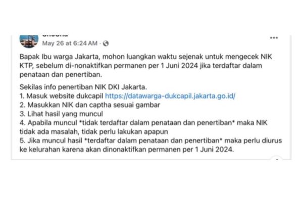 Sebuah unggahan di Facebook mengimbau kepada warga pemegang KTP DKI Jakarta untuk mengecek NIK nya sebelum dinonaktifkan permanen pada 1 Juni 2024.
